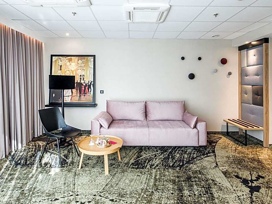 This double room features a electric kettle, air conditioning and bathrobe. There is a separate seating and sleeping area, sofa bed and mini bar in that room